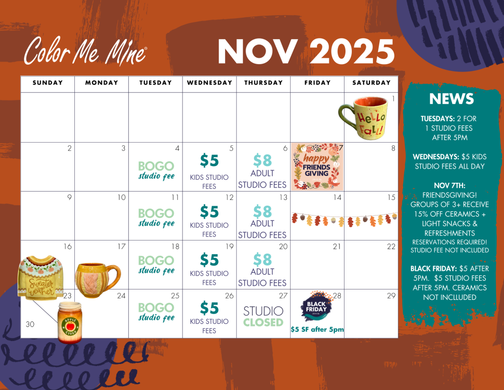11/7: Friendsgiving Event: 15% off ceramics after 5pm! Snacks and refreshments will be served.  Reservations required to enjoy discount/snacks.  Studio fees not included.