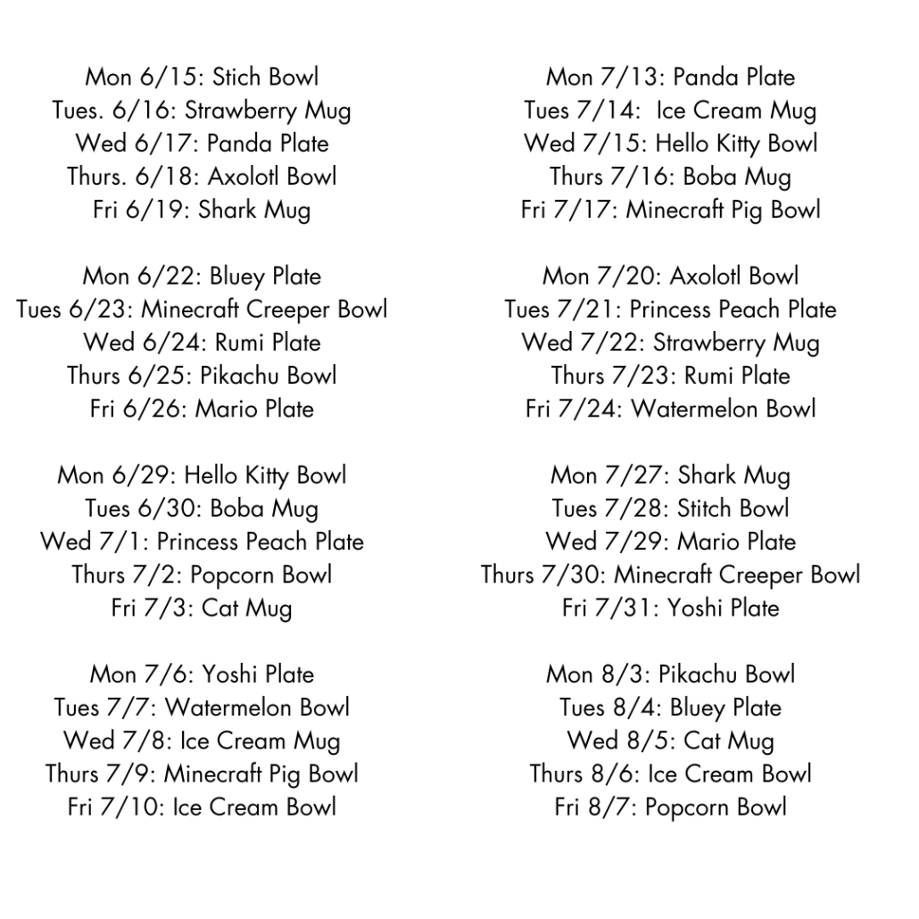 Classes will be held Mondays through Fridays (6/15-8/7) from 10:00 am-11:30am.